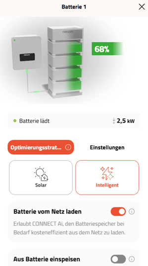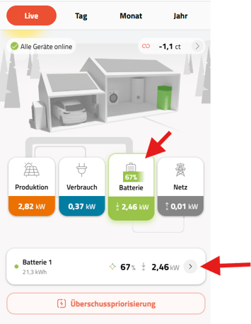 Nach dem Klick auf den Pfeil bekommt der User auf der Detailseite für den Speicher einen Überblick über den aktuellen Status, wie zB "Batterie voll geladen" oder "Batterie lädt", sowie die Auswahl für die Ladestrategien.