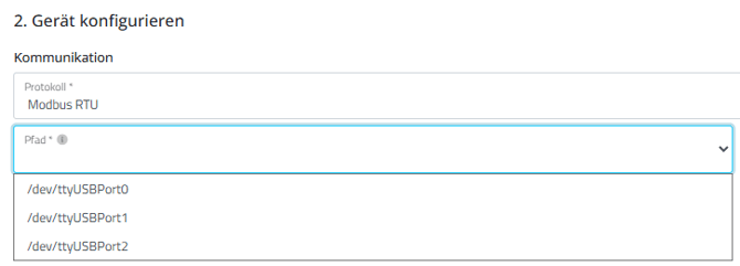 Stecke den "Modbus RTU auf USB Adapter" in den USB Port des BEAAM und wähle in der neoom CONNECT Gerätekonfiguration den richtigen USB Port.