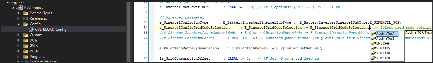Das TwinCAT-Projekt ist auf den aktuellen Stand vom 16.10.2025 (>= 2.3.7) zu bringen und unter GVL_BLOKK_Config auf 30P einzustellen, wichtig ist dann noch den richtigen Ländercode im SPS-Programm über den Wert e_SinexcelConfigGridCodeSelection (im Bild unterhalb ersichtlich) auszuwählen. Bspw. wenn der NEA in Österreich installiert ist, muss entweder TOR-Typ A oder TOR-Typ B.