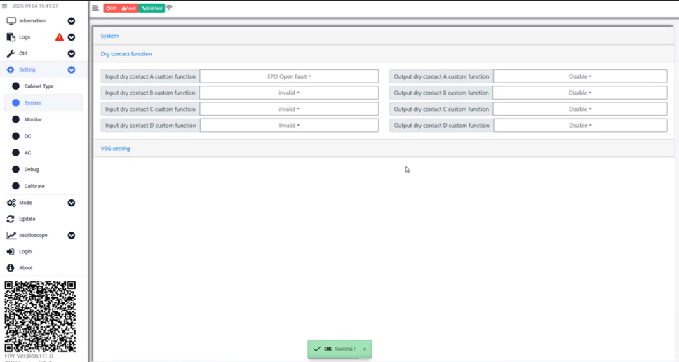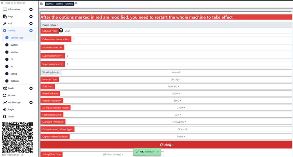 Um die Inverter zu konfigurieren ist es verpflichtend die Geräte manuell über die AC-Seite zu starten. Bei einem Start über der DC Seite kommt es zu einem Time Out des MBMS und die Batterie-Piles werden weggeschaltet, somit startet der Inverter neu und der IBN-Prozess muss vollständig wiederholt werden.