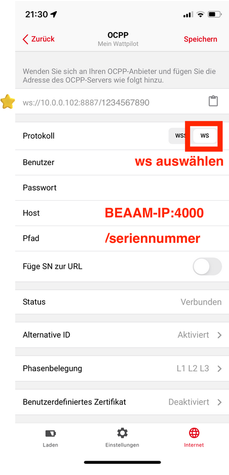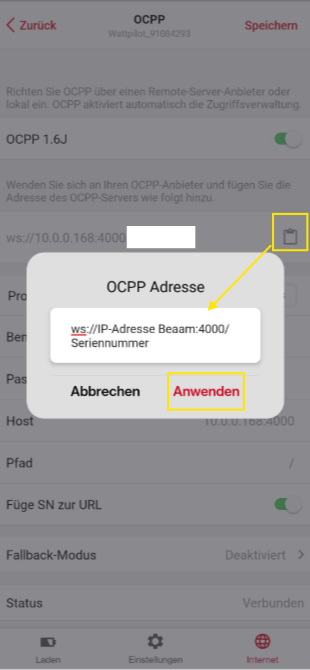 Falls die in den einzelnen Punkten eingetragenen Werte (Protokoll-Auswahl, Host, Pfad) nicht in die OCCP Server Adresse (⭐) übertragen werden, müssen diese manuell eingetragen werden. Dazu muss das "Clipboard" Symbol rechts neben der Adresse angeklickt werden und die Adresse nach folgendem Schema manuell eingetragen werden: ws://IP-AdresseBEAAM:4000/Seriennummer (z.B.: ws://10.10.10.121:4000/123456789