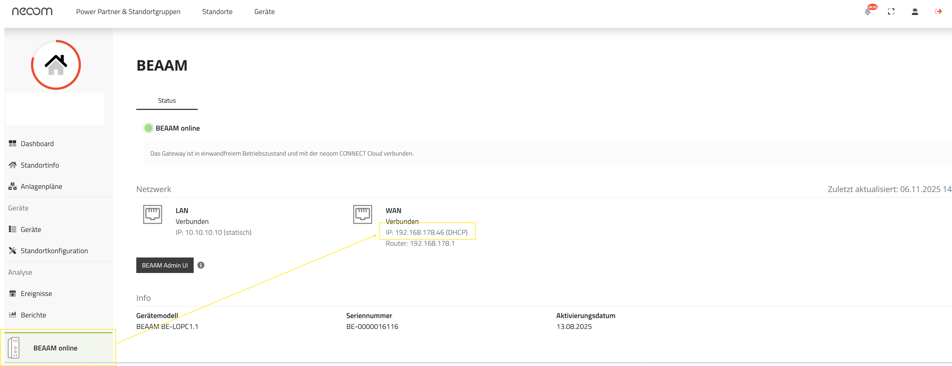 2.) Host: Als Host ist die IP-Adresse des BEAAMS, gefolgt von Doppelpunkt und 4000 einzutragen. (zB.: 10.10.10.121:4000). Die IP Adresse des BEAAMs findest du auf dem neoom CONNECT (connect.neoom.com) Standort -> BEAAM Informationsseite, oder direkt auf der Weboberfläche des BEAAMs.