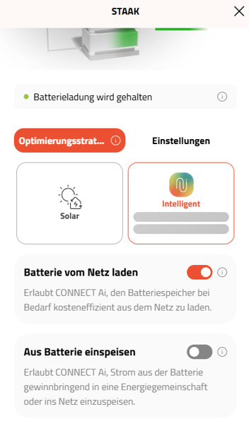 In der neoom App kannst du bei den Batterieeinstellungen angeben ob du die Batterie aus dem Netz laden möchtest und ob du aus der Batterie in das Netz einspeisen möchtest.