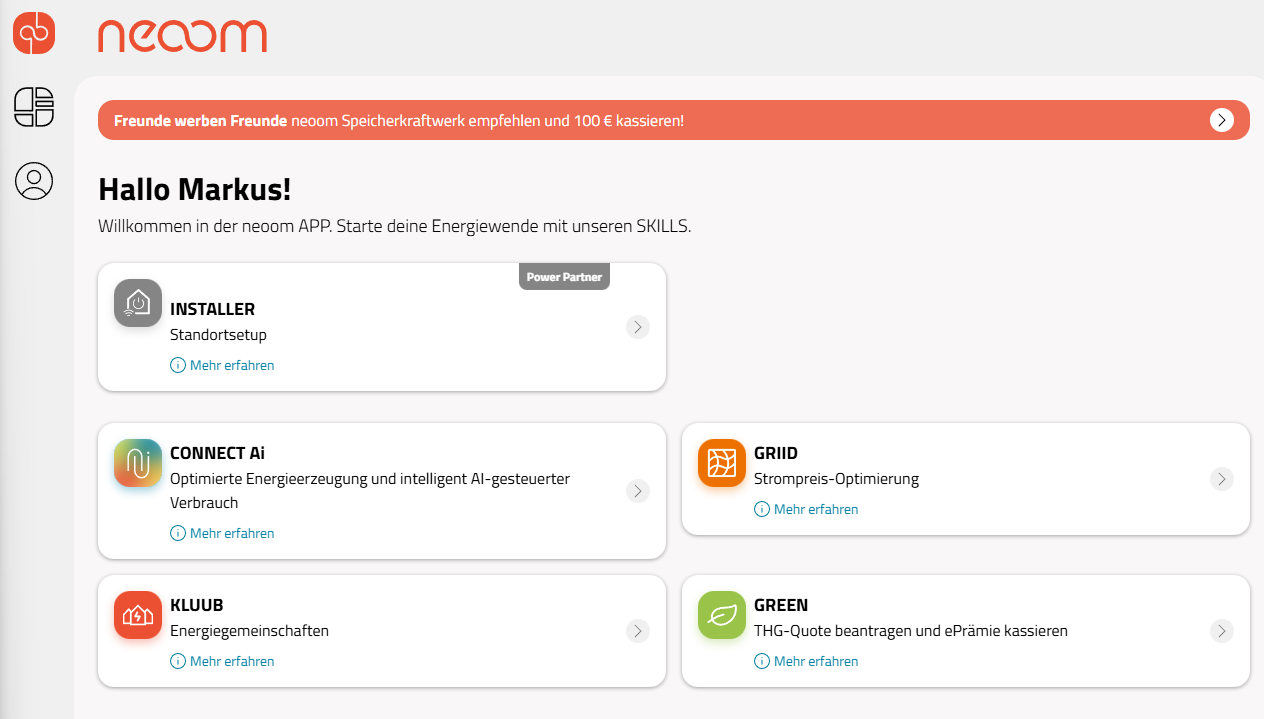 Mit der neoom App als Teil der Inbetriebnahme, kann der Partner den Endkunden ganz einfach in ein paar Schritten dort die App erklären.