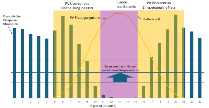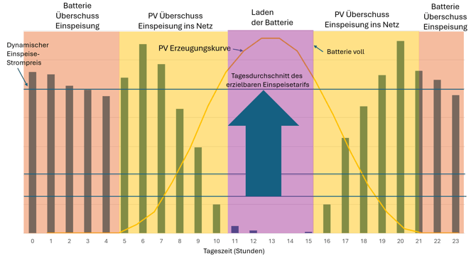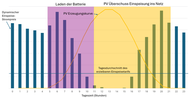 Die folgende Grafik zeigt die 24 Stunden eines typischen Sommertags mit dem Verlauf des Strompreises (blaue Balken), der PV Erzeugungskurve (gelb) und den Zeiten, wo normalerweise ein nicht intelligentes Batteriesystem die Batterie lädt (lila Fläche) und in das Netz einspeist (gelbe Fläche).
